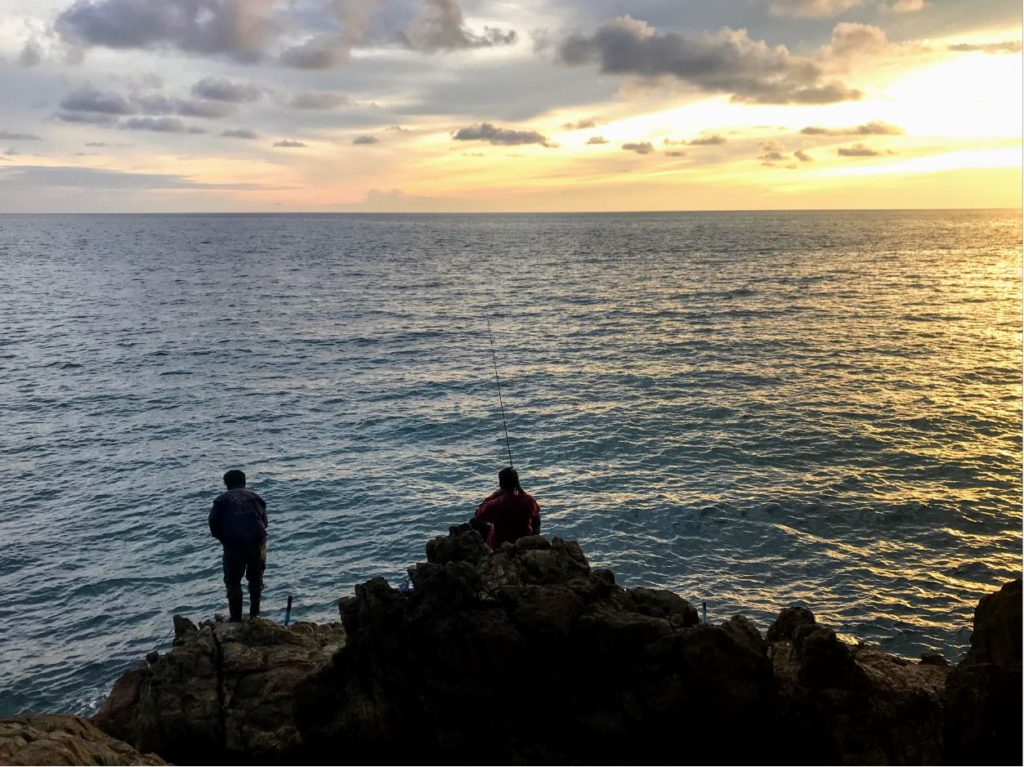 ผู้ชายตกปลาบนฝั่งที่ว่างเปล่า